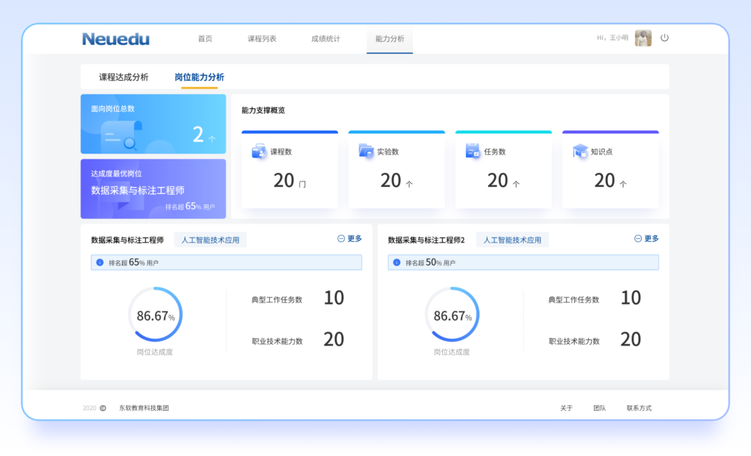 根据目标岗位能力模型和核心能力要求,构建实践技能点与人才和岗位自适应匹配,使得学生能力模型化、学习智能化、成果可视化、过程可监控、人才可评测、岗位可匹配。