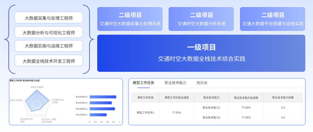 实训室的实践任务和内容设计基于交通领域大数据技术人才的典型工作任务和职业技术能力要求;实训室平台可以为每个实践任务定义知识技能点,并根据实践任务的完成情况给予知识技能点、职业技术能力和岗位能力达成度等相关数据分析和可视化展现报告。