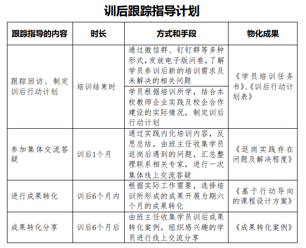 此次培训采用目标牵引学习的方式,并将“参训学员任务书”作为考核项之一,参训教师根据个人情况填写训前、训中、训后阶段的培训需求、预期目标、培训任务及成果转化和所需支持。根据老师们的情况,我们制定了针对本次培训的训后跟踪指导计划实施方案。