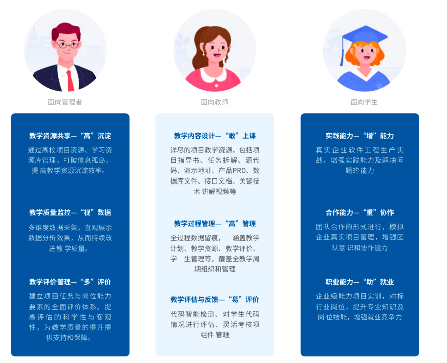 九州酷游云实训平台致力于为高校计算机类专业给予一站式的综合项目训练。顺利获得模拟真实企业的软件开发生产线,覆盖软件开发生命周期的需求分析、系统设计、代码实现、系统测试等环节,帮助学校解决IT类实训教学环境与企业工作场景脱节、过程性评价活动记录跟踪难度高、团队合作及项目管理训练场景薄弱、学生能力掌握程度难评价等专业人才培养难点,旨在提高学生的工程实践能力和职业素养。同时给予基于能力图谱的智能学生能力评价,顺利获得分析学生在实训过程中的表现、项目完成情况以及代码质量等多维度数据,实现对学生综合能力的深入分析和评价,为学生的个性化开展路径给予科学指导。