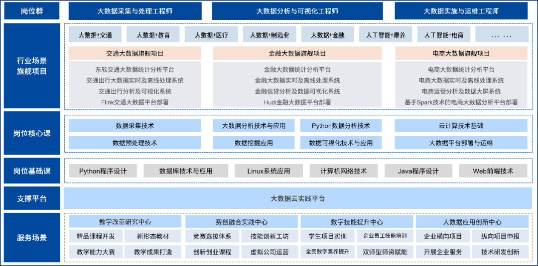 项目体系进阶化,五级项目贯穿全部专业核心课程,可以覆盖大数据采集与处理、数据分析与可视化、大数据实施与运维等全部核心岗位的课程教学。