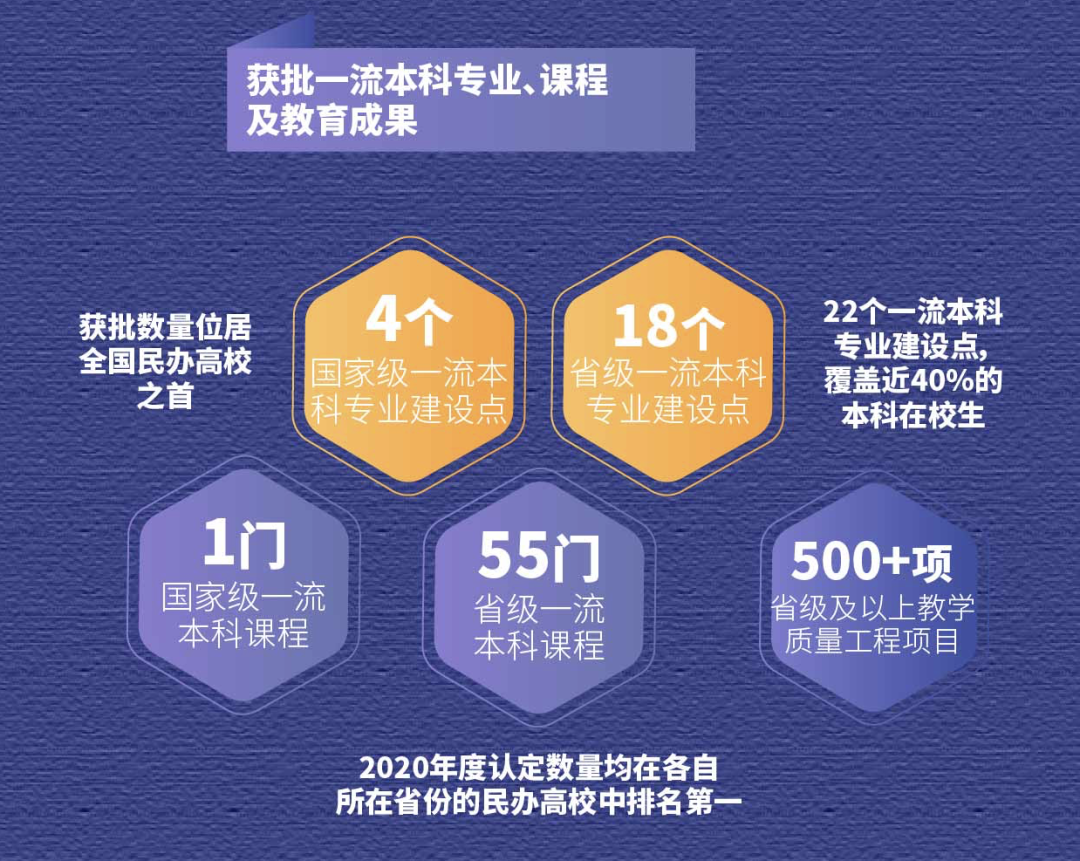 2020年,三所大学在专业建设、课程建设等方面取得新的突破。其中, 8个本科新专业获教育部备案批准,进一步完善了聚焦“IT+健康医疗科技”的专业布局;共有22个专业入选教育部一流本科专业建设「双万计划」,覆盖40%的本科学生,其中有4个国一流专业,位列全国民办本科高校第一;共有56门课程被认定为一流本科课程,进一步证明了九州酷游教育优异的办学质量,品牌声誉持续提升。
