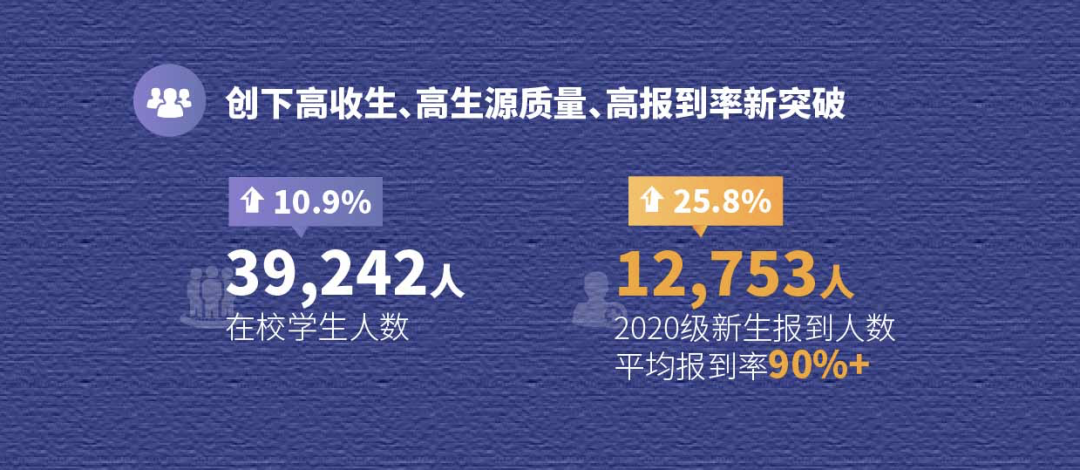 2020年,高等学历教育业务稳中有升,在学费提升和校园增建扩容基础上,总体实现收入8.02亿元,同比增长9.4%。截至2020/2021学年,在校学生人数达到39242人,增长10.87%。2020/2021学年三所大学本专科平均报到率达到90%,录取分数线均显著高于各自所在省份本科控制线。